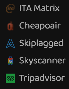 | ✴ Kayak ✴ Google Flights ✴ CheapOAir ✴ Priceline ✴ Skyscanner ✴ ITA Matrix |